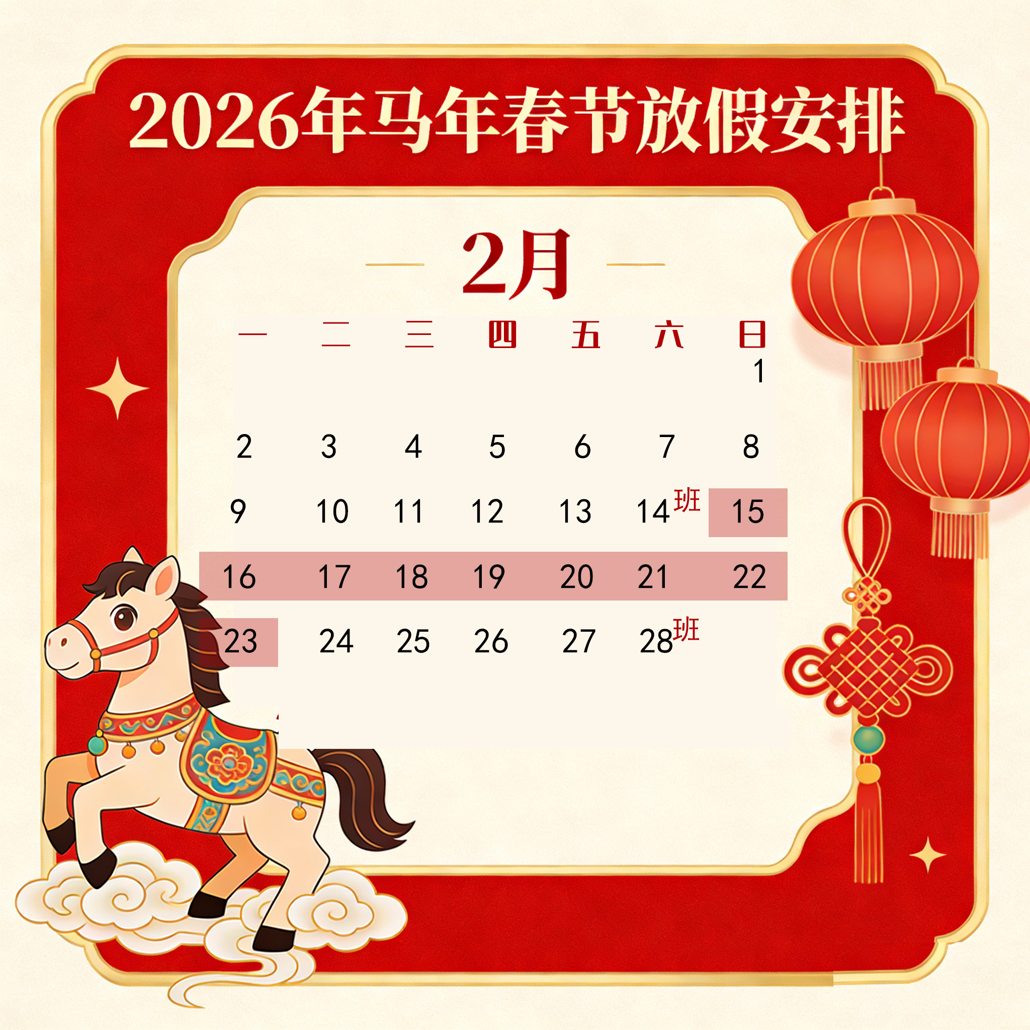 2026年春节放假安排如下:春节:2月15日(农历腊月二十八、周日)至23日(农历正月初七、周一)放假调休,共9天。2月14日(周六)、2月28日(周六)上班。阳光太仓人才网网站相关业务及问题依然可以发站内信,如有特殊问题请电话咨询0512-33002112、0512-33003311 ,微信:1987127758。
